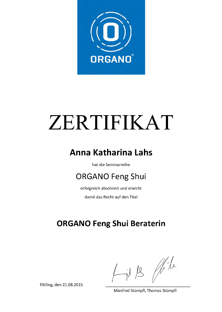 April 2015: Beginn der Ausbildung ORGANO Feng Shui (Seit Herbst 2008 bin ich Hausorgantikerin. Später hat ORGANO die Ausbildung optimiert zu ORGANO Feng Shui.)